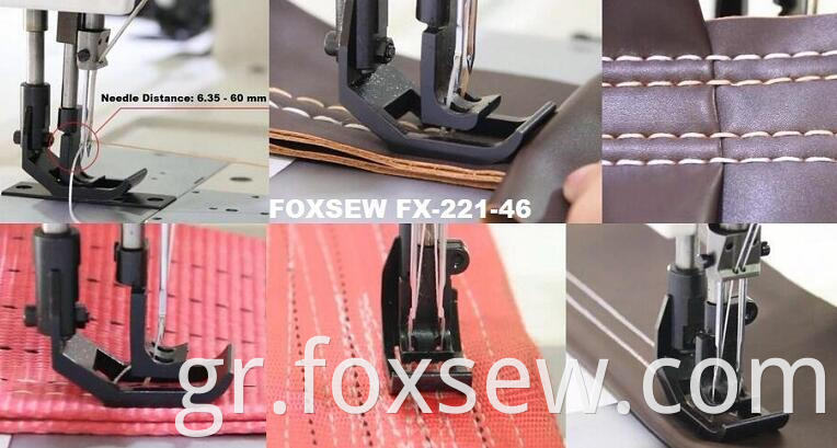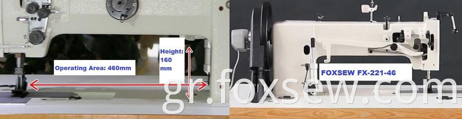 FOXSEW FX-221-46 Long Arm Double Needle Flat Bed Triple Feed Πόδι Ποδόσφαιρο Extra Heavy Duty LockStitch Ράψιμο Μηχανή για δερμάτινη ταπετσαρία και βαρέως φορτίου Webbings, για το ράψιμο υλικών επιπλέον βαρέων βαρών όπως δέρμα, καναπέ, καμβά, βινυλίου, συνθετικά και διάφορα Επικαλυμμένα, ελασματοποιημένα και ελαστικά υφάσματα. Κατάλληλο για ράψιμο, όπως σκηνές, tarps, τέντες, καλύμματα φορτηγών, ταπετσαρία αυτοκινήτων και επίπλων, καλύμματα πεδίου, δομές υφασμάτων και βαριά ογκώδη προϊόντα.